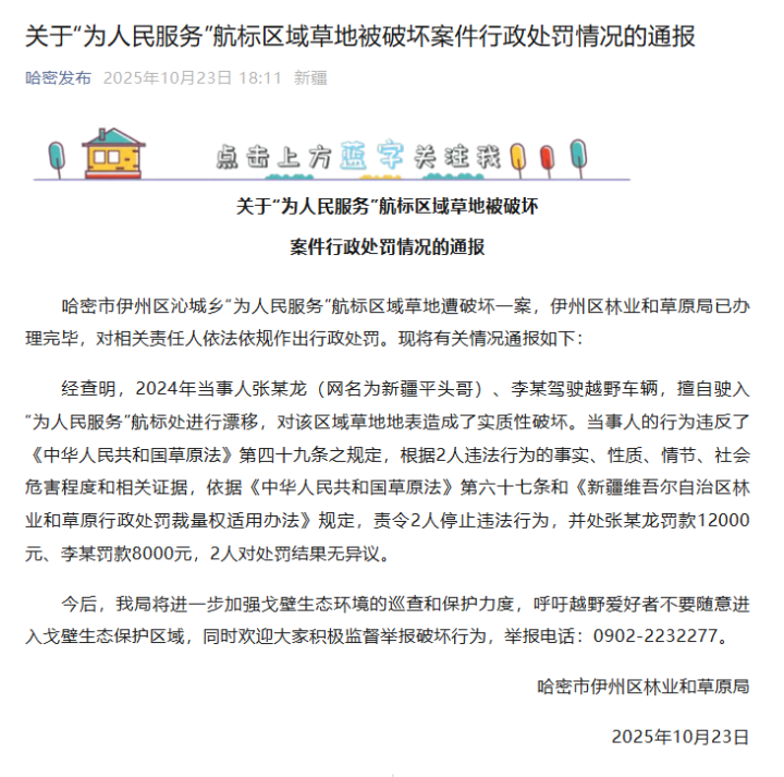 此前报道:官方通报“为人民服务”航标被破坏调查进展:张某龙(新疆平头哥)、李某驾车漂移造成草地地表破坏,已立案调查此前视频